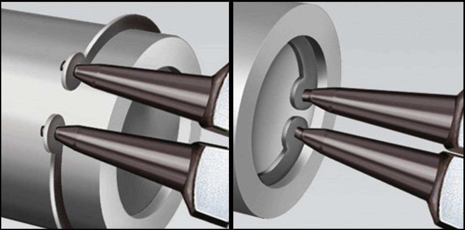 Kit de alicates con 4 cabezales para extraer abrazaderas y arandelas circlip. Los cabezales se adaptan a anillos interiores y exteriores.