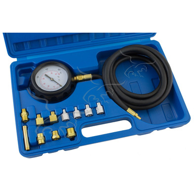 Juego para medir la presión o compresión de aceite con manómetro para comprobar y diagnosticar problemas en el sistema de aceite, bombas, cigüeñal... Sus múltiples adaptadores permiten un acople rápido y la longitud de la manguera una movilidad constante. Fácil comprobación de la presión de la bomba de aceite.