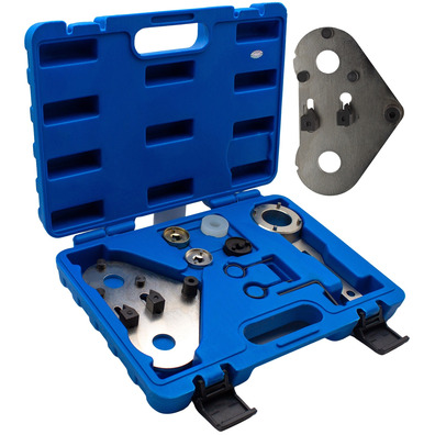 Conjunto de herramientas y útiles de calado para el Grupo Vag. Compatible con motores gasolina 1.8 y 2.0 de Audi, Seat, Volkswagen y Skoda montados con cadena de distribución. Incluye herramienta de bloqueo del piñón con OEM T20208, pasadores comunes, vasos de ajuste de levas y llave para retención de la polea del cigüeñal. Es conveniente revisar los códigos OEM necesarios para cada reparación, es posible que sean necesarias herramientas adicionales (genéricas) del grupo VAG.