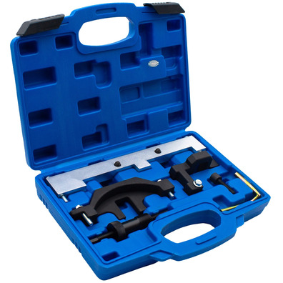 Juego de calado y sincronización de motores gasolina BMW 1.6 L 4 cilindros 16 V montados con cadena de distribución. Incluye la placa de retención Vanos y los útiles necesarios para quitar o reemplazar la cadena bloqueando el árbol de levas de admisión y escape así como dejar en la posición correcta el sistema de sincronización variable de válvulas. Válido para los modelos de la gama serie 1 y 3 hasta el año 2010.