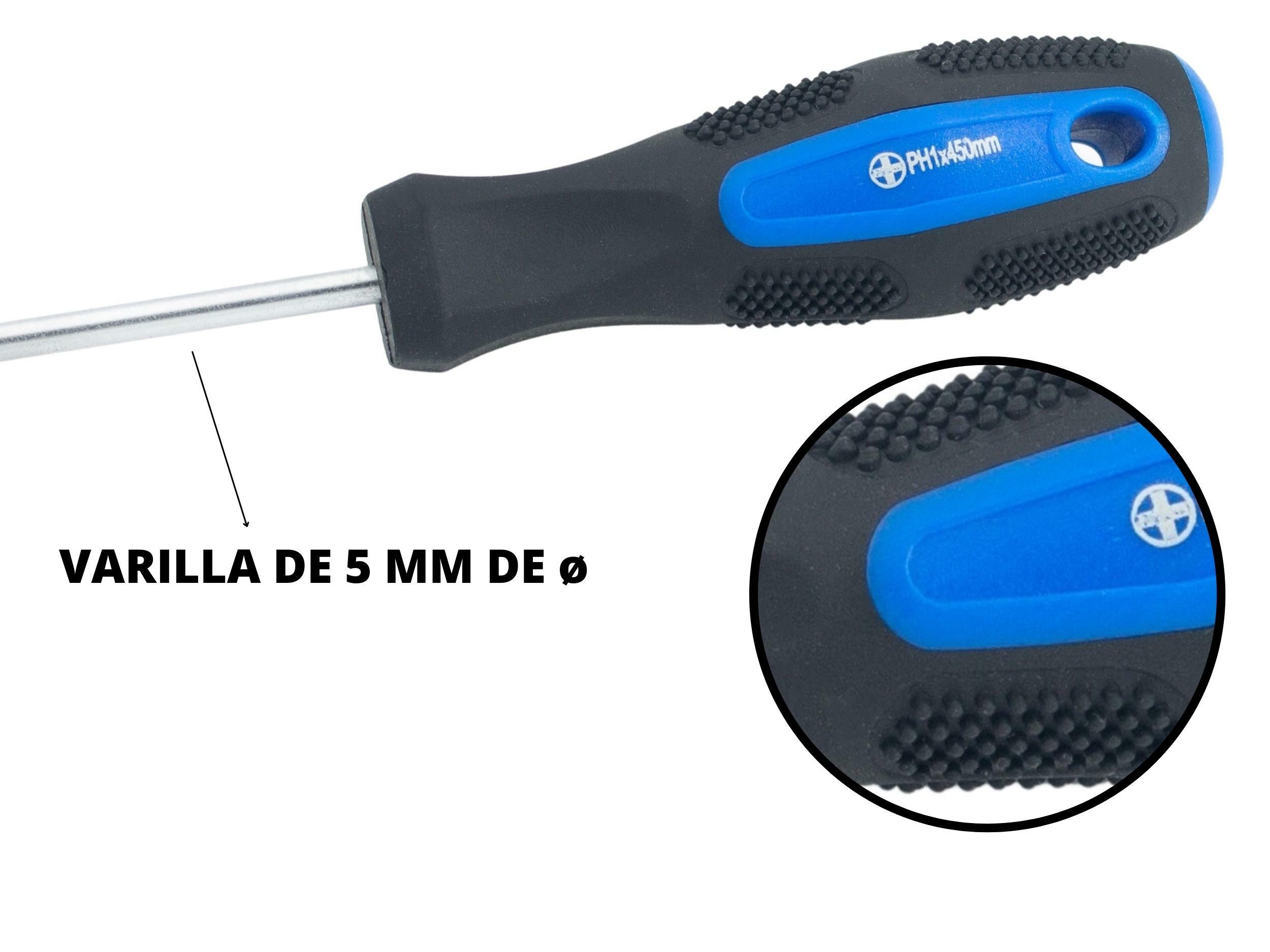 ✓ DETALLES TÉCNICOS ✓ 2 destornilladores de estrella PH1 y PH2 │ 2 destornilladores planos de 5 y 6 │ Longitud: 45 cm (varilla de 34 cm y mango de 11 cm)