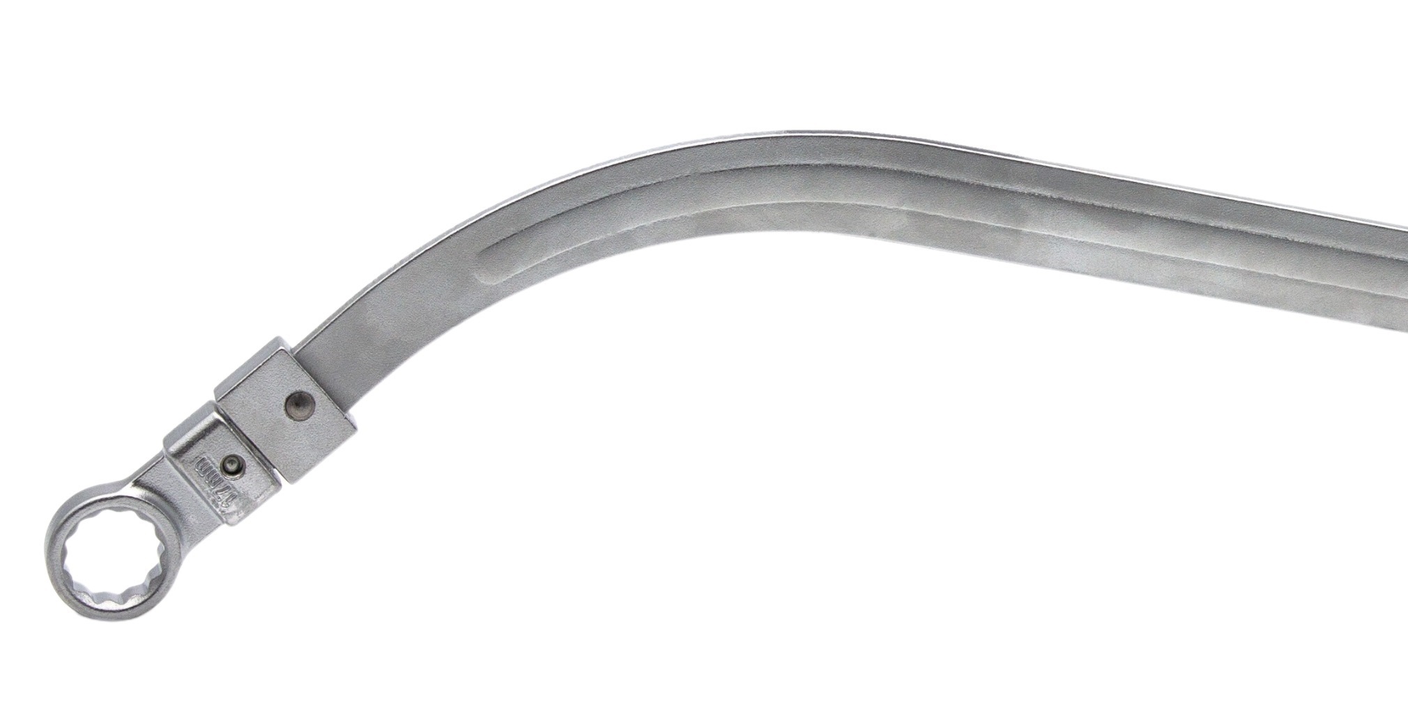 Llave curvada para ajustar, tensar, desmontar o montar correas de distribución y poleas tensoras. Habitualmente estas piezas están alejadas o con otros componentes que obstaculizan el acceso, pero gracias a su longitud y curvatura será sencillo el giro, ejercer la fuerza requerida y llegar al tornillo o tuerca.
